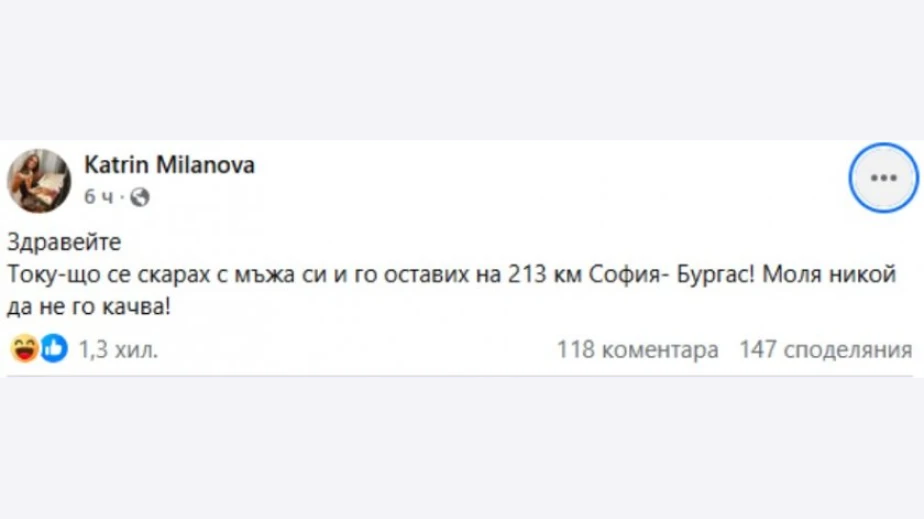 Жена заряза мъжа си на магистралата за Бургас и помоли никой да не го качва. Постът на дамата в социалните мрежи предизвика истинска лавина от коментари - аплодисмети и одобрителни отговори от жени и възмутени мъже. От тях обаче не се разбира дали завалията е успял да се добере до крайната точка на дестинацията или още скита немил - недраг по пътя, пише Lupa.bg