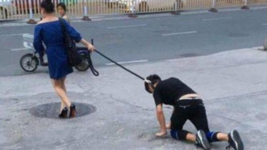 Привлекателна млада дама в синя пола и на високи токчета шокира жителите на китайския град Фужу като се разходи с приятеля си, на когото беше поставила кучешка каишка, в оживен час на централно място, съобщава "Мирър", предава БЛИЦ.