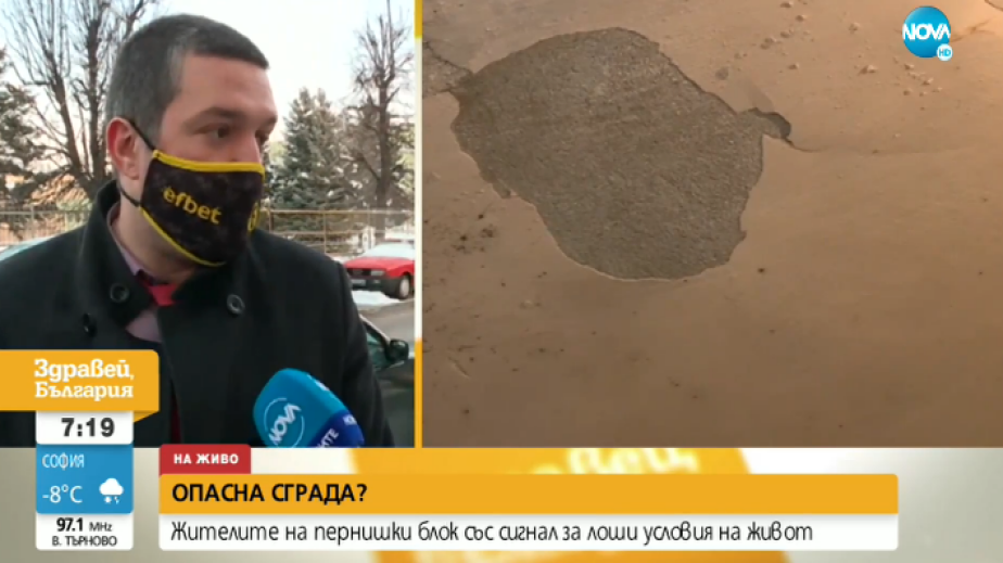 „Да, наистина има подадени сигнали. Общината като собственик на близо 50 % от жилищата на този вход, може да участва в ремонта на общите части на входа. Тук става въпрос за това, че живущите трябва да свикат общо събрание. Блокът никога не е подавал документи за участие в програмата за саниране", обясни Стефан Кръстев, зам.-кмет на Община Перник./Източник: НТВ