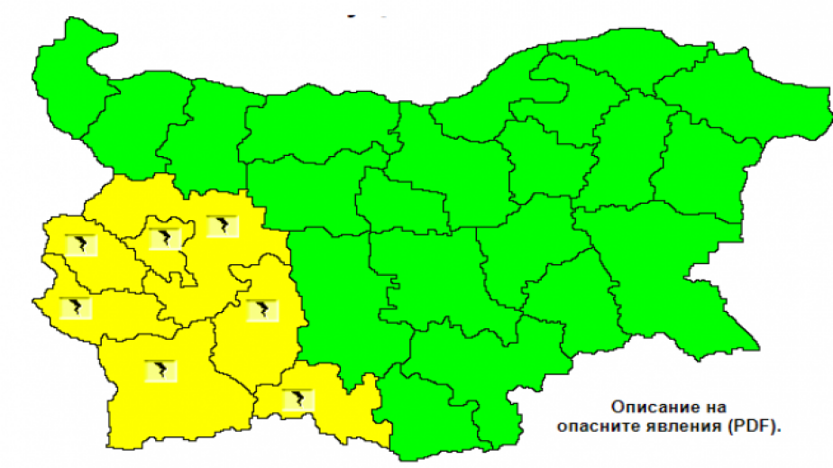 В няколко области на Югозападна България е в сила жълт код за опасни гръмотевични бури.