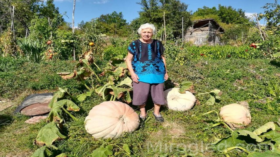 Възрастната жена отглежда в градината си всякакви зеленчуци и се радва на добра реколта, въпреки че почвата не е плодородна, защото селото е планинско. Освен гигантската тиква, в градината и има и домати, които тежат по 700-800 гр.