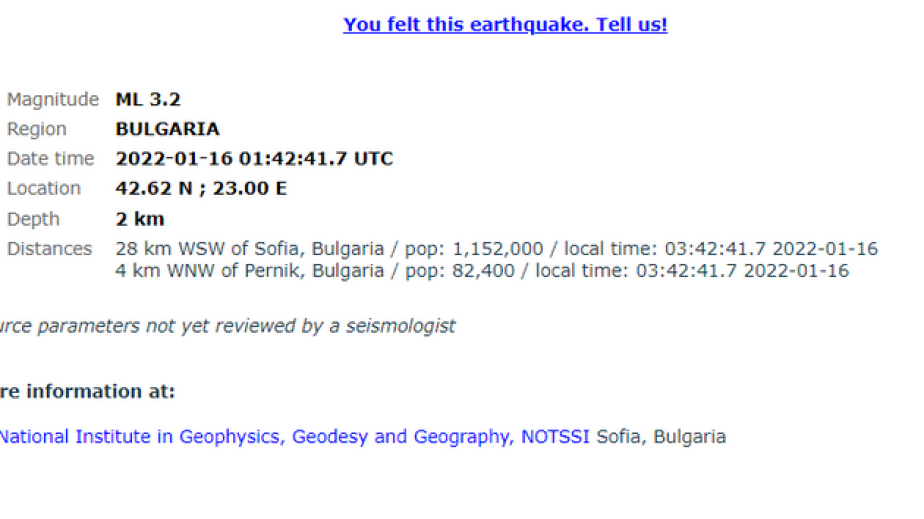 Земетресение разлюля Перник малко преди 4 ч. тази сутрин. То е с магнитуд 3,2 по Рихтер, сочат данните на Европейския сеизморогичен институт.