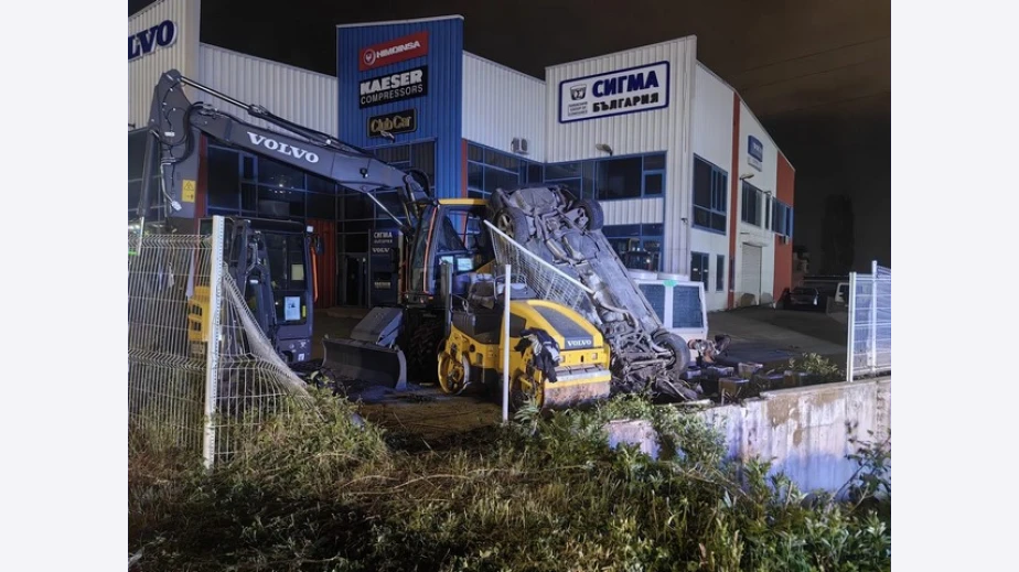 На мокрия път колата е поднесла няколко пъти и се забила в багер, паркиран пред сграда на фирма.